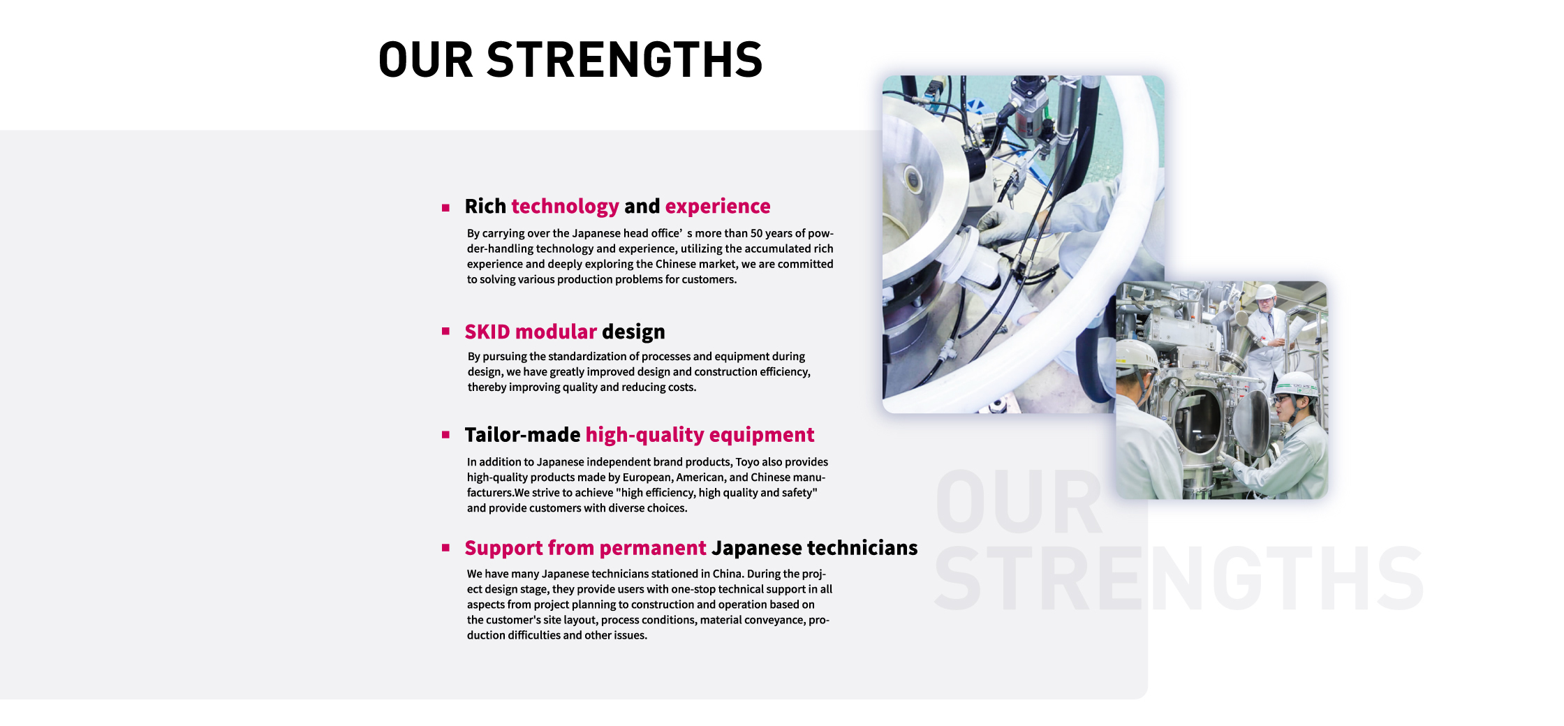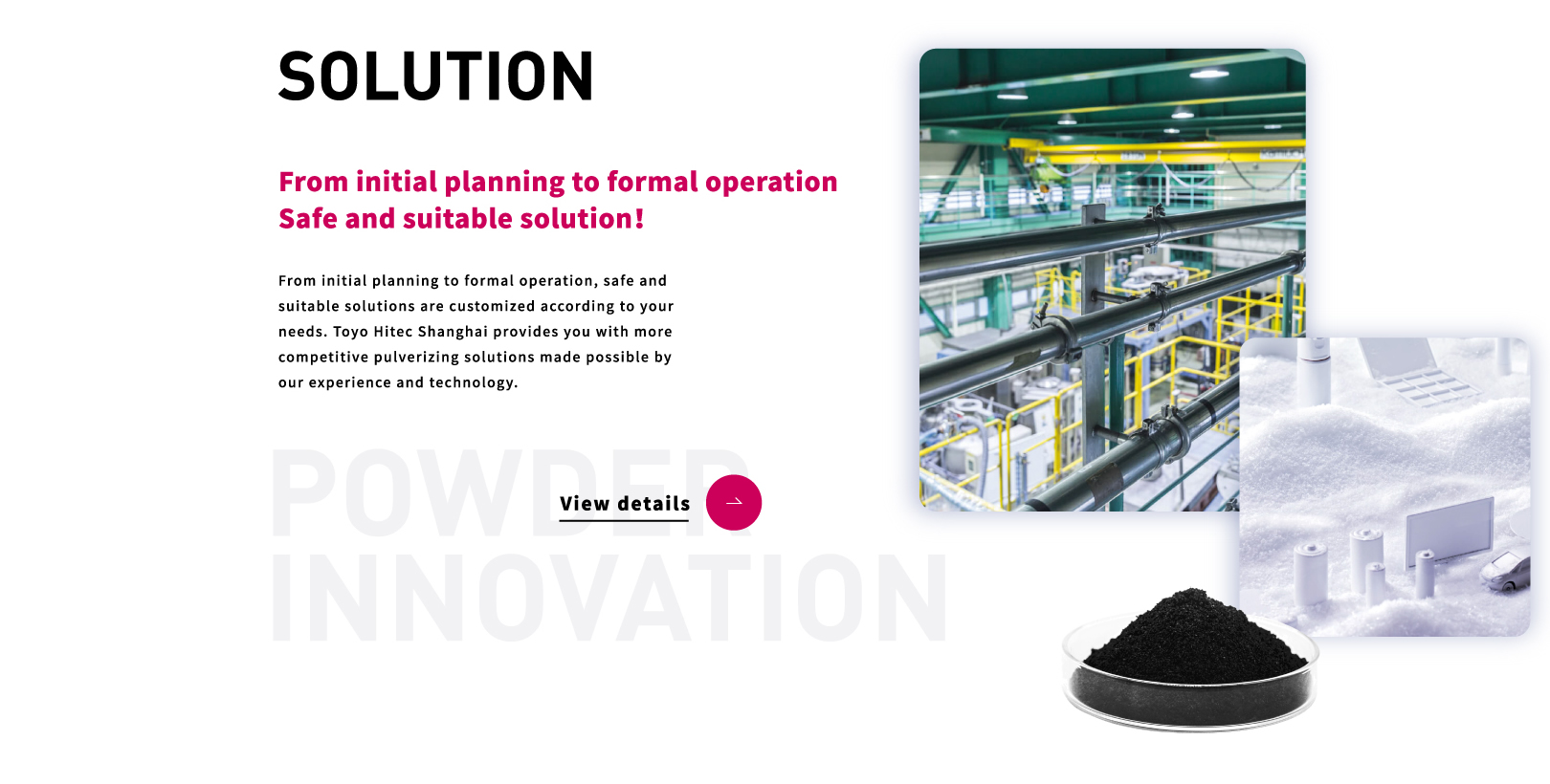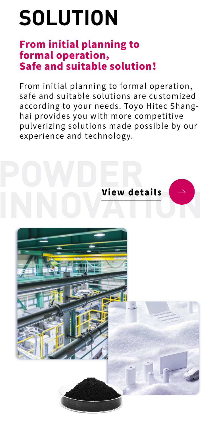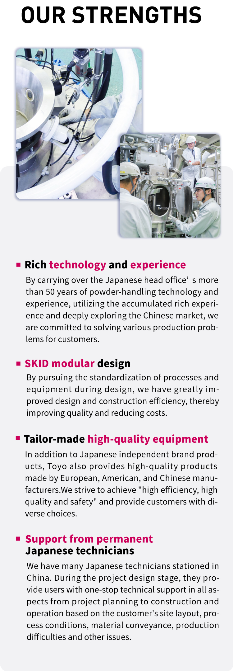 Toyo provides process solutions for upstream positive and negative electrode material companies of power batteries, including feeding, metering, batching, sintering, pneumatic conveying, crushing, mixing, sieving, and packaging. It also provides fully automatic production lines that are dust-free, labor-saving, and free of foreign matters.