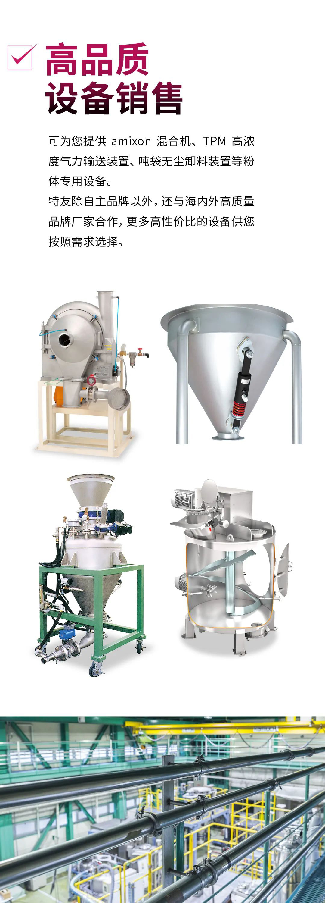 特友總公司東洋高科技于1964年創(chuàng)立,擁有「粉體系統(tǒng)工程業(yè)務(wù)」和「粉體機(jī)器的開(kāi)發(fā)和銷售」為一體的粉體設(shè)備經(jīng)驗(yàn)與技術(shù)。為中國(guó)、日本、美國(guó)、東南亞的企業(yè)客戶提供與有關(guān)粉體有關(guān)的設(shè)備服務(wù),幫助客戶解決了諸多生產(chǎn)難題。