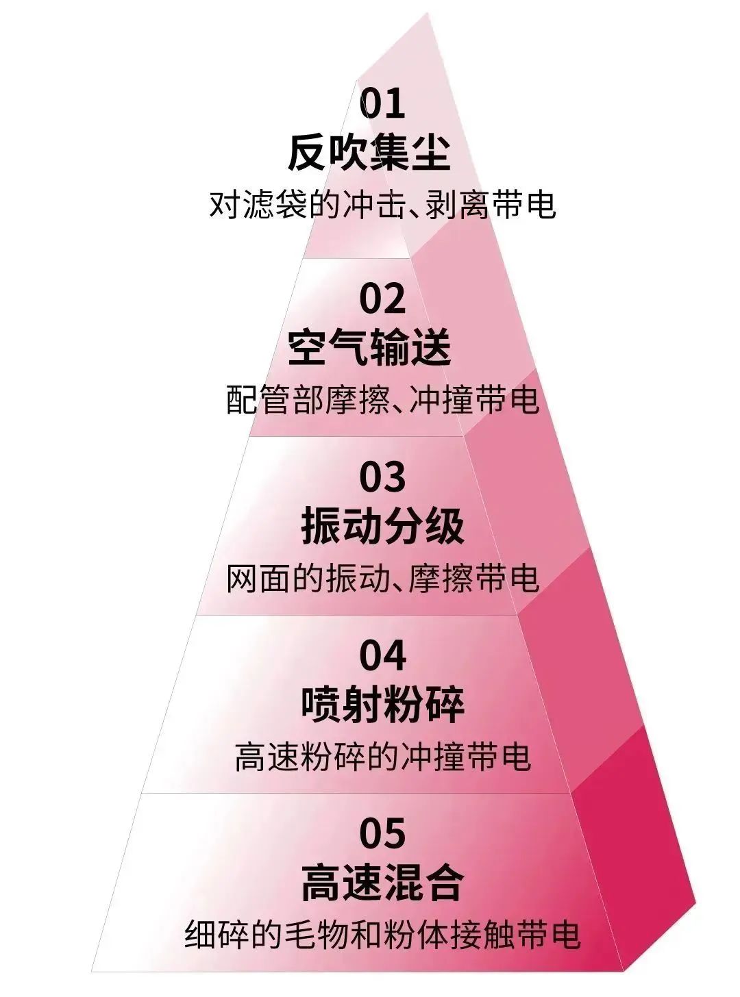 如下圖所示,使用空氣輸送設備和集塵器組合的粉體處理理論上會產生較多的靜電,進行實粉運送調試后粉體的帶電量數據是重要把控對象。
